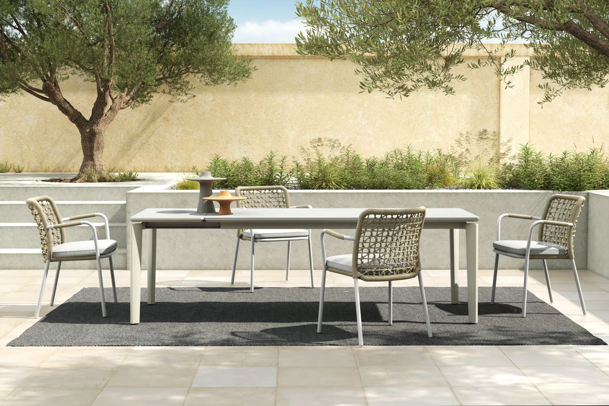 | Construction | Powder coated aluminum frame / Rope back / Custom made cushions |