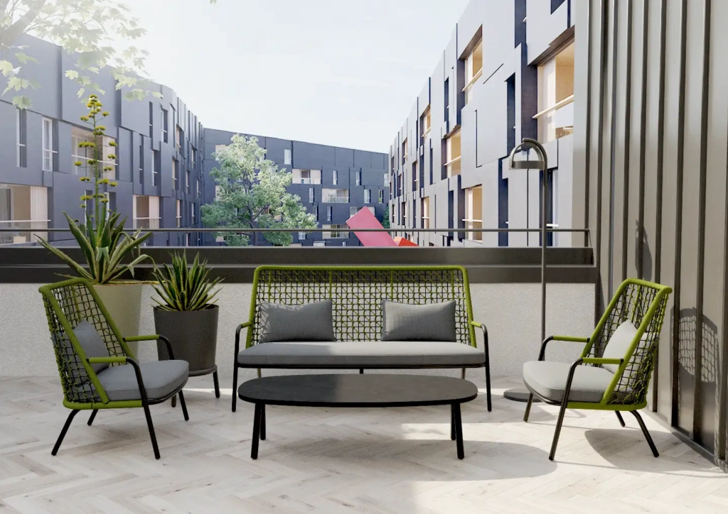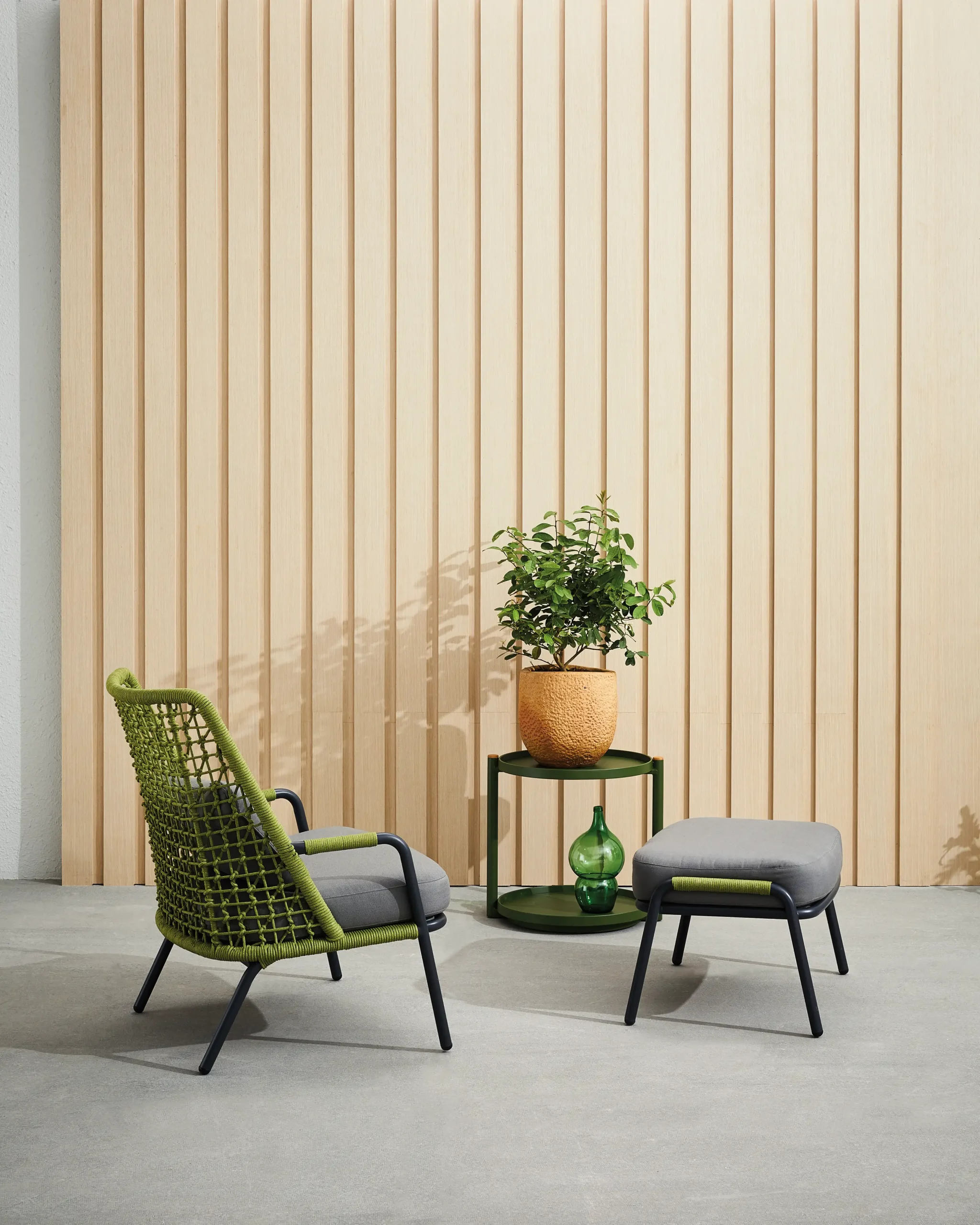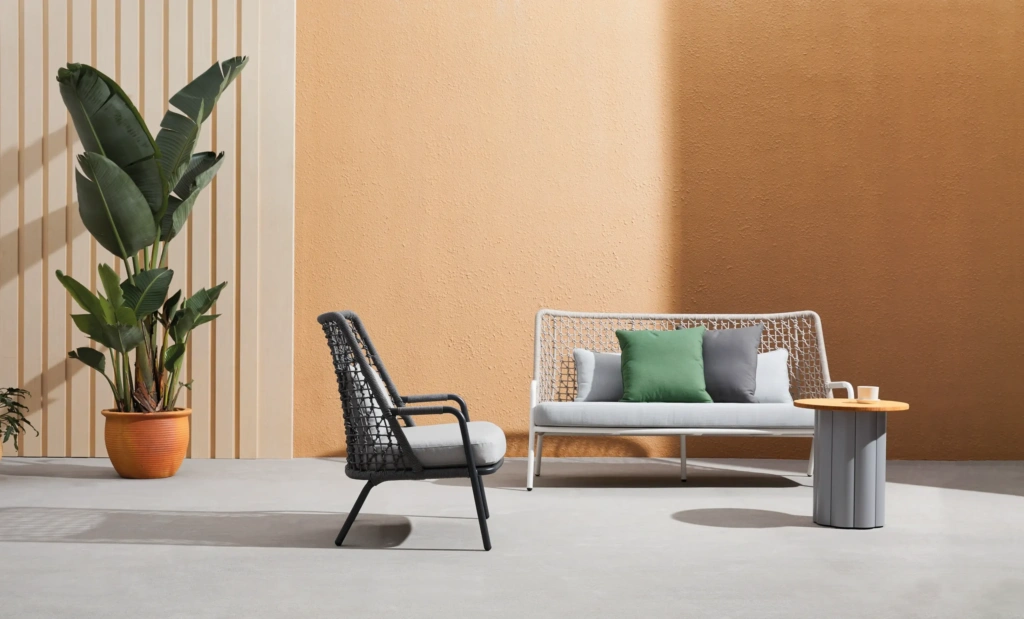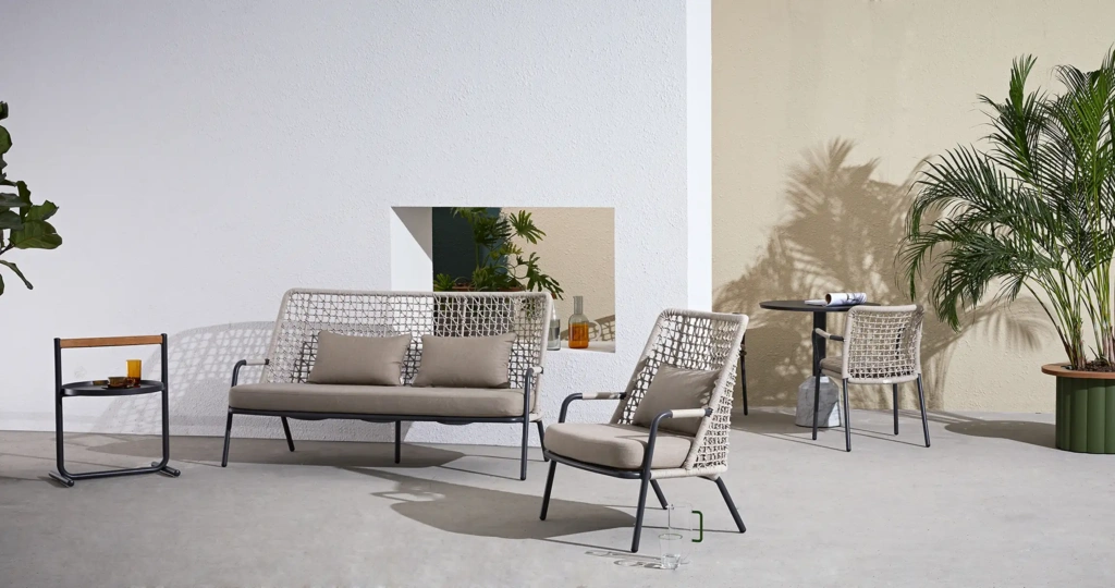 | Construction | Powder coated aluminum frame / Rope back / Custom made cushions |