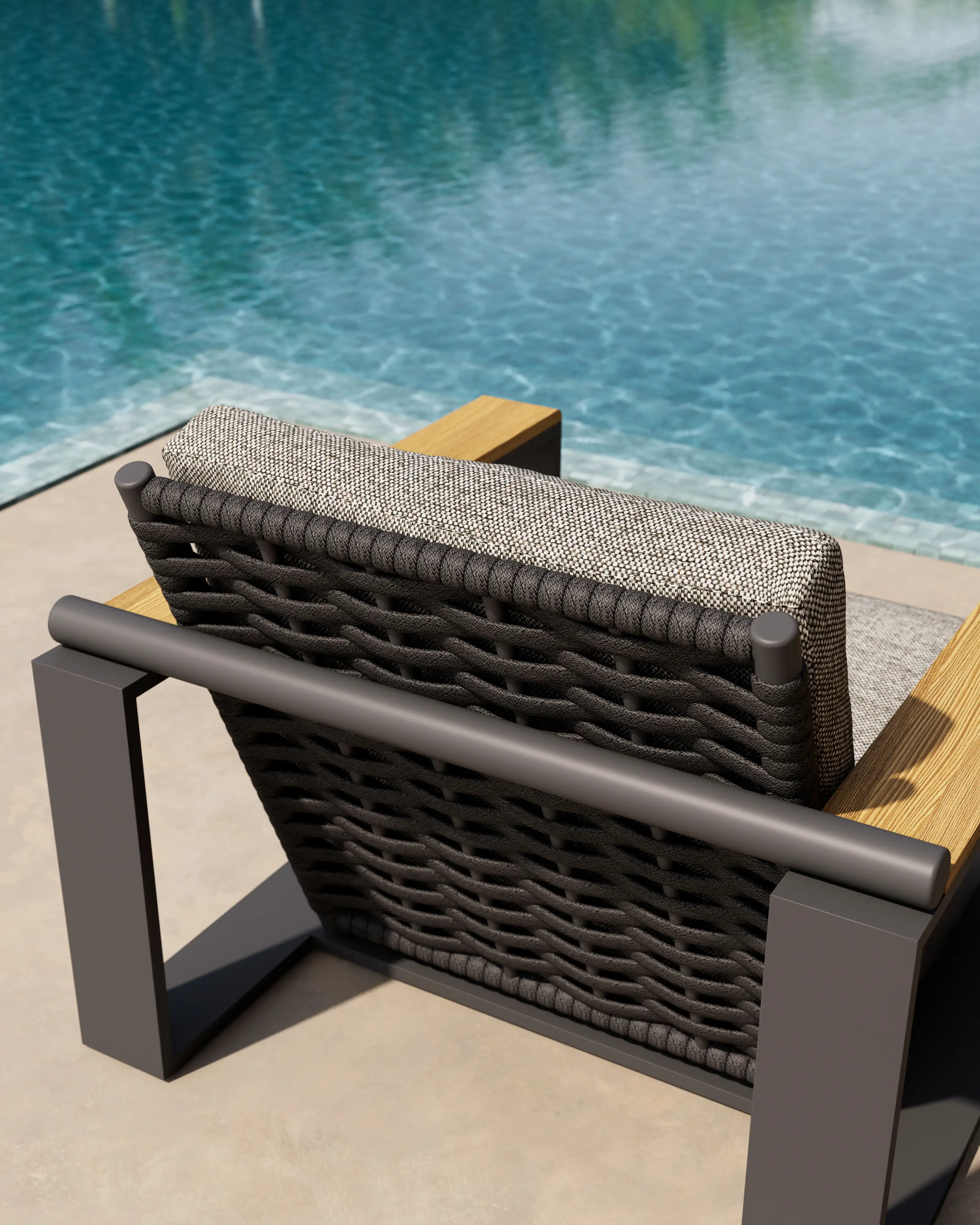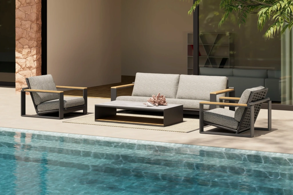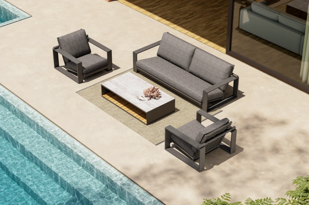 | Construction | Powder coated aluminum frame / Strap back / Custom made cushions |