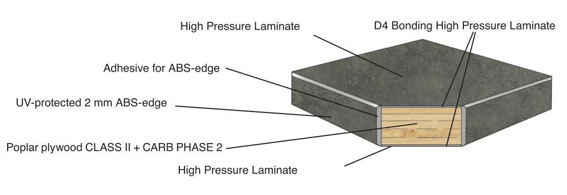 Venice table tops are glued together using a specially developed technology of poplar veneer board and HPL coating in a moisture-resistant manner and are therefore suitable for outdoor use.